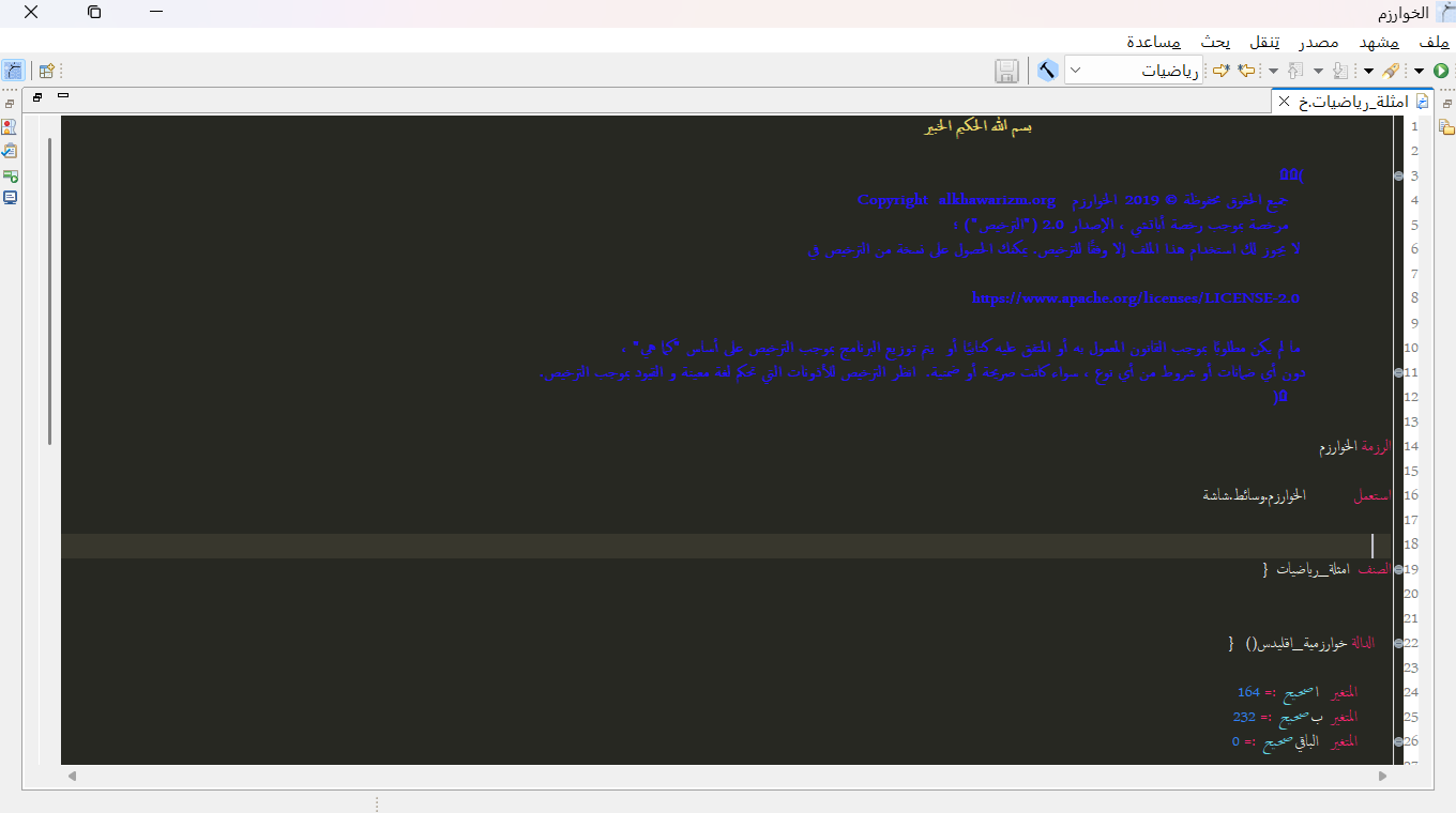 آخذين بالاعتبار الدعم غير المكتمل لمعظم النظم للغة العربية، تم تصميم بيئة التطوير المتكاملة للخوارزم لتدعم اللغة العربية بشكل جيد.